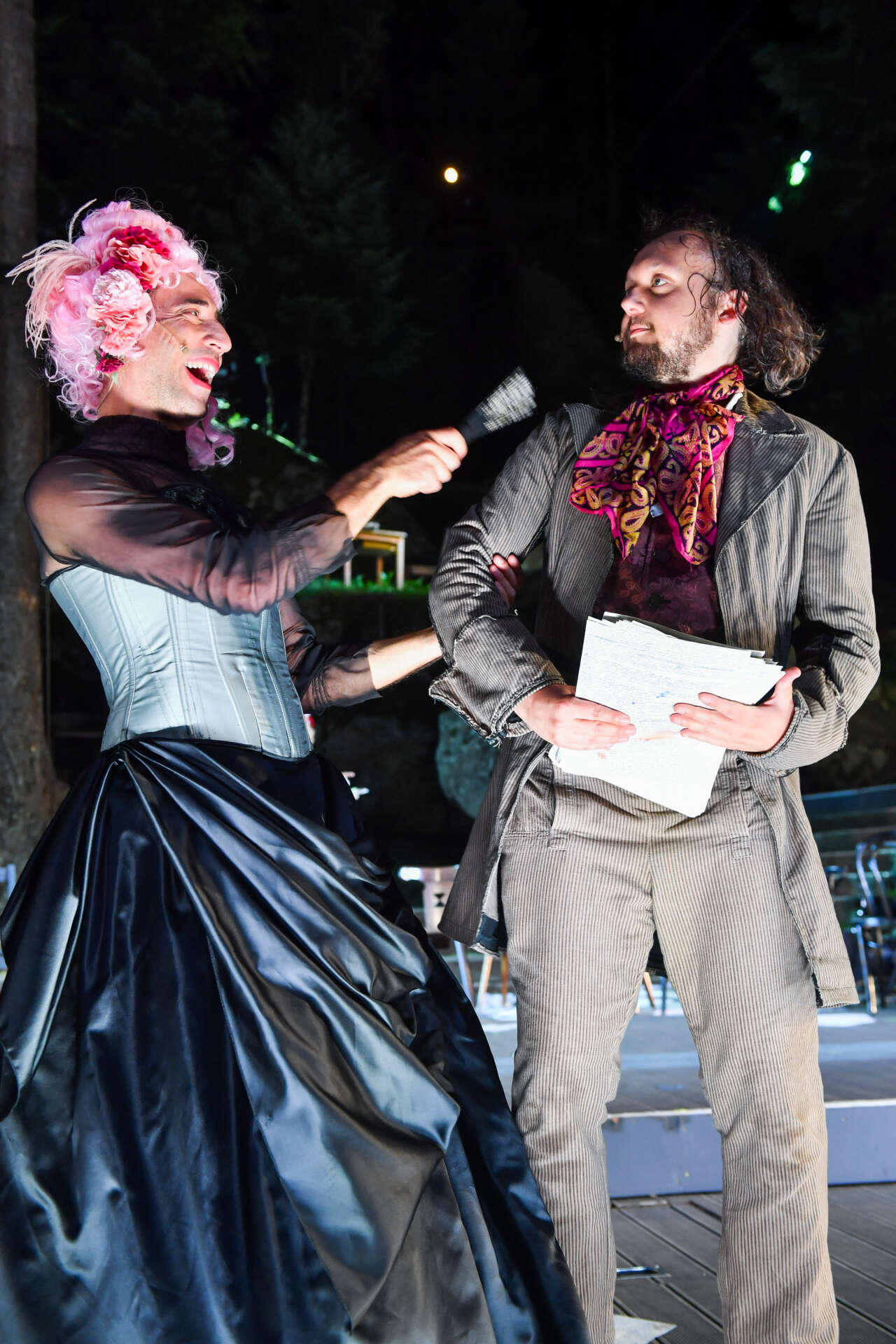 Als Wahnsinnsjoker fungiert der dritte Profi im Bunde, Manuel Karadeniz. Souverän gibt er gleich drei Rollen und singt die einzigen zwei Soli des Stücks. Als affektierte Charlotte von Kalb zieht er „köstlich“ die Fäden in einem überkandidelten Literaturzirkus. Als teuflischer Karl Ludwig Sand dirigiert er den Pakt, der dem alten Jean Paul seine Jugend zurückgibt, wenn er auf seinen Ruhm als Schriftsteller verzichtet.