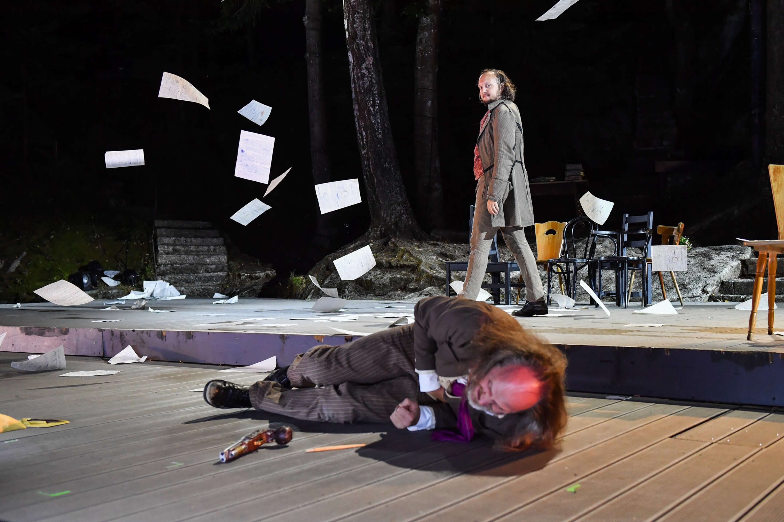 Respekt: Drei Profis und 21 Laiendarsteller switchen in zweieinviertel Stunden durch 120 Rollen – und zwar so, dass es bei der ,Hoppelpoppel“-Premiere mühelos wirkte. Das doppeltes Jean- Paulchen geben Andreas Leopold Schadt (als alter Dichter) und Julian Niedermeier (als junger) ebenso selbstzweiflerisch wie komisch: Drama, Hass, Irrsinn – all das steckt drin in dem doppelbödigen Spiel, das beide Schauspieler grandios beherrschen. Zuschauer bekommen so einen umfassenden Eindruck von Jean Paul.